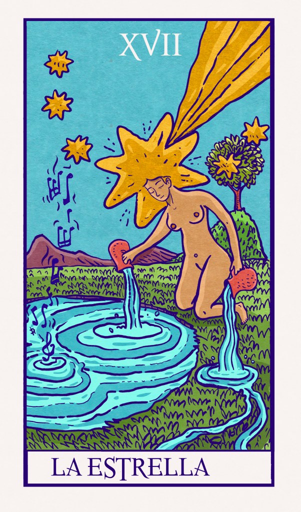 La Estrella es una bruja vibrando en su nido: es sabia y también intuitiva. Aunque la vemos lejana, debemos entender que es nuestra otra madre, la Gea ancestral, dándonos cobijo e influjos creativos. En ella la constitución tripartita de los seres humanos, espiritual, racional y mental, alcanza el equilibrio.
